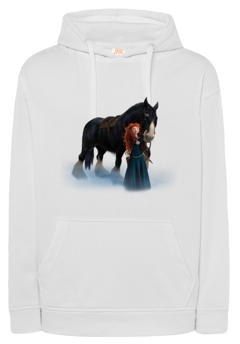 Biała, wygodna bluza z kapturem ozdobiona wzruszającym wizerunkiem księżniczki Meridy i jej wiernego wierzchowca Angusa z animacji "Merida Waleczna". Grafika przedstawia moment spokojnej bliskości między ognistowłosą księżniczką w szmaragdowej sukni a majestatycznym, potężnym czarnym koniem z charakterystyczną białą plamą na pysku. Delikatna mgiełka u ich stóp dodaje ilustracji tajemniczego, szkockiego klimatu.